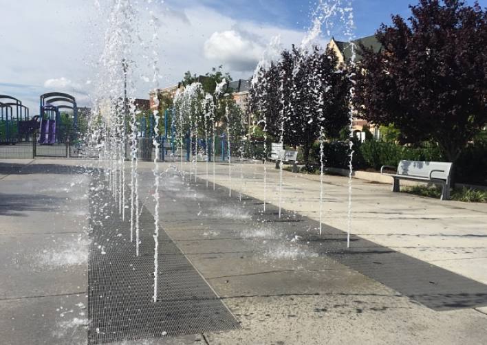 The Potomac Yard Park Interactive Fountain, located between the two playgrounds, features thirty-six water jets, including twelve laminar jets which shoot a stream of water between two troughs and lighting at the jets for nighttime effects.